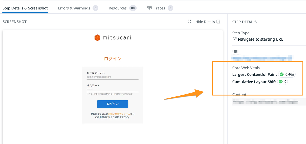 また、Datadogではテスト実行時にパフォーマンスチェックも同時にできます。これはReal User Monitoring(RUM)という製品を併用すると見れるようになります。